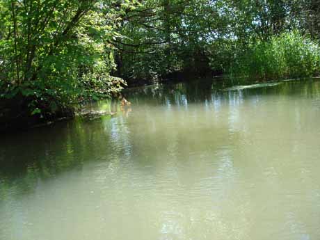 So geht die Fahrt weiter, immer begleitet von den Tieren, den Graureihern, dem Nutria und der Bisamratte. Hier und da sind auch Fische zu sehen, wie etwa die Brachse. Die Durchbrüche von den den Quellen werden immer größer und Schilder weisen darauf hin, dass die Einfahrt mit dem Boot den Fischern vorbehalten bleibt. Immer häufiger Fallen Holzpfähle auf, die knapp aus dem Wasser ragen. Dabei handelt es sich um Befestigungen von Barrieren, die den Weg des Wassers etwas vorgeben sollen. Da die Elz wegen des Kanals und den ausbleibenden Überschwemmungen verlandete, wollte man diesem Effekt entgegen wirken. Aus dem nahen Kanal wird nun bei Hochstand Wasser eingeleitet, das wie eine Überschwemmung wirkt und den aufgehäuften Sand mitreißt. Damit das Wasser aber auf einigermaßen geregelten Bahnen fließt und nicht gleich das ganze Ufer mitnimmt, wurden die Barrieren gebaut. Sie geben eine Richtung vor, ohne zu kanalisieren.