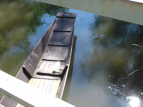 | Ein Stocherkahn liegt bei der „Zuckerbrücke“ bereit für die Bootstour. |