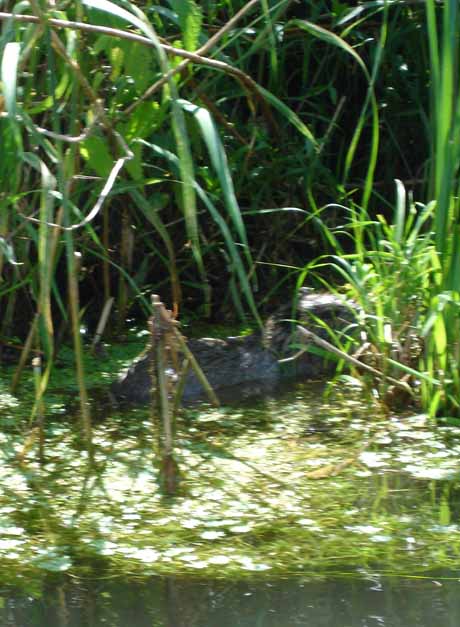 Ein Stück weiter hören wir Krähen rufen. Sie hocken in den Bäumen am Ufer, weit über uns. Warum sie sich versammelt haben, wird klar, als wir an einer Entenfamilie vorbeikommen. “Die Krähen holen die Jungen”, sagt der Bootsführer. “Die sitzen nicht ohne Grund genau über uns.” Ob es unsere Anwesenheit macht, dass die jungen Enten plötzlich aus der Deckung des Ufers kommen und dicht an uns vorbeischwimmen? Riskant ist es trotzdem, die Krähen brauchen nur herabzustoßen. Und an uns würden die sich nicht stören. Die Eltern quaken nervös und die Jungen gleiten eilig in den Schutz des Uferschilfs zurück. Die Krähen aber sind noch lange zu hören.