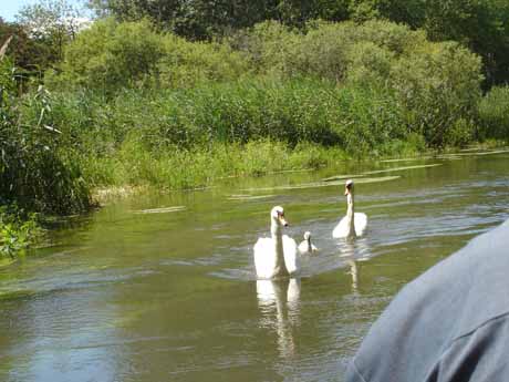 Auf einmal taucht neben dem Boot ein Schwanenpaar mit einem Jungschwan auf. Dieses Paar hat im Schilf gebrütet, erkärt der Bootsführer, und an der dunklen Gefiederfärbung könne man erkennen, dass der Jungschwan männlich sei. Weibliche Jungschwäne sind von Anfang an weiß. Die Schwäne im Taubergießen sind allesamt Höckerschwäne. Den Namen haben sie von einem Höcker auf dem Schnabel. Dieser ist bei den männlichen Schwänen größer, so könne man das Geschlecht von erwachsenen Tieren auseinander halten. Außerdem haben die Männchen einen dickeren Hals.
