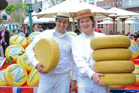 Mit ihren original orangefarbenen Hüten präsentieren die Käseträger vom Käsemarkt aus Harfsen ihren schweren Gouda. Das Treiben wird von altholländischen Marktleuten abgerundet, die den Besuchern neben der Kunst des Glasblasens und des Spinnens auch die Herstellung frischer Butter und von Senf näher bringen.